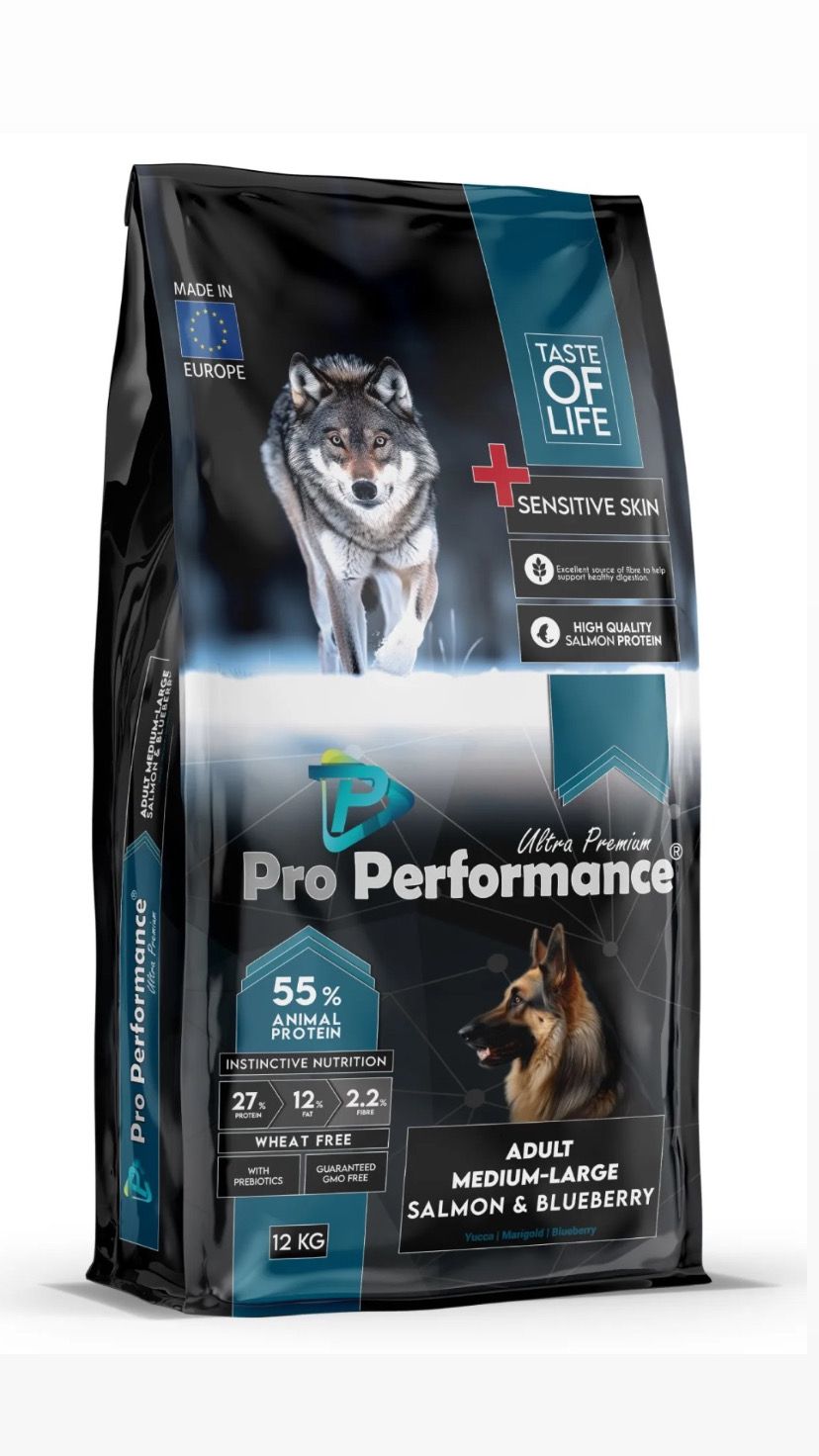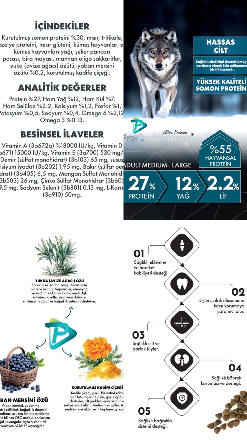 Pro Performance Somonlu yetişkin Köpek Maması 12kg Ürün Özelliği / Indication: Tam ve Dengeli Ekstrude Kuru Yetişkin Köpek Maması / Complete and balanced extruded dry adult dog food İçindekiler: Kurutulmuş Somon Proteini (%40), Baldo Pirinç(%16), Mısır, Rafine Tavuk Yağı, Hamsi Unu(%12), Bira Mayası, Hamsi Yağı, Harnup, Nükleotit Maya Proteini, Kurutulmuş Şeker Pancarı, Mineraller, Prebiotik Mannan Oligo Sakkaritler, Deniz Yosunu, Yaban Mersini Tozu, Avizeağacı Özütü, Pisilyum, Kadife Çiçeği Tozu, PhenomindTM (%0,024). Ingredients: Dehydrated Salmon Protein (40%), Baldo Rice(16%), Maize, Refined Chicken Oil, Anchovy Meal(12%), Brewers Dried Yeast, Anchovy Oil, Carob, Nucleotide Yeast Protein, Dried Beet Pulp, Minerals, Prebiotic Mannan Oligo Saccarides, Seaweed, Blueberry Powder, Yucca Extract, Psyllium, Marigold Powder, Phenomind™ (0,024%).
